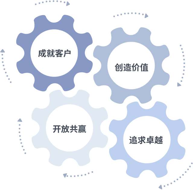 成就客户是一切决策的出发点,,创造价值是衡量所有工作的标准,,追求卓越是我们做事做人的态度,,开放共赢是我们的格局也是最终的结果。。。。价值观的齿轮环环相扣,,,,推动着组织里的每个人不断向前。。。