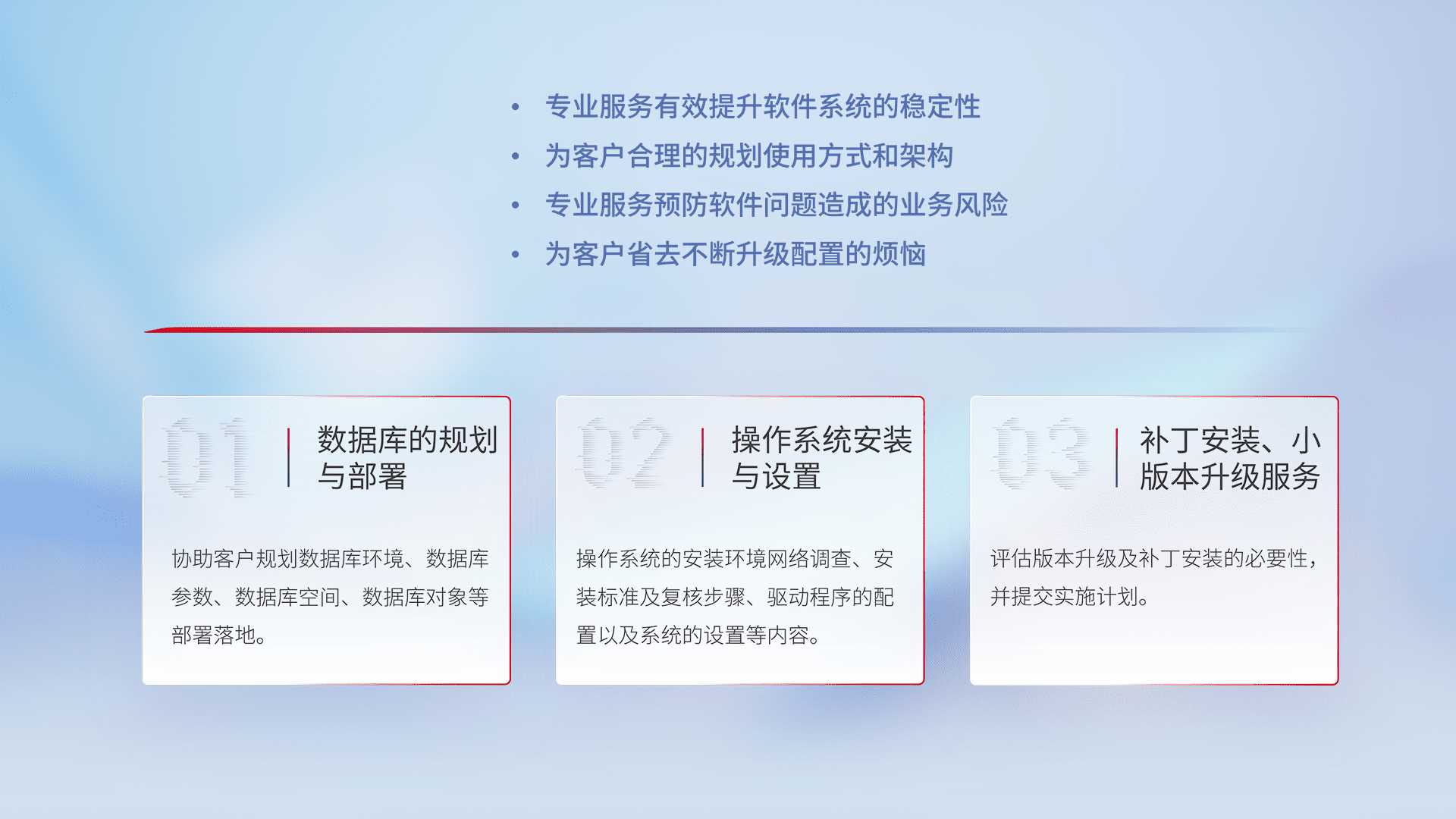 为客户提供软件规模升级、、快速部署、、按需配置的专业服务,,从数据库的规划与部署到操作系统的安装与设置,,再到补丁安装和小版本升级提供支持。。。。